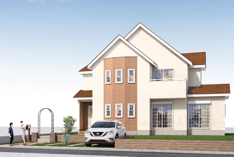 格子状のサッシ窓や勾配のある切妻屋根、多角形の壁面、アーチ形の玄関まわりなど、コロニアル様式やヴィクトリアン様式といったアメリカ東部の伝統的な住宅デザインに通じる意匠が随所に見られます。さらに外構にはブルーベリーの植栽やアンティーク調の門柱、ガーデンアーチなども取り入れられており、風景にやわらかな彩りを添えます。